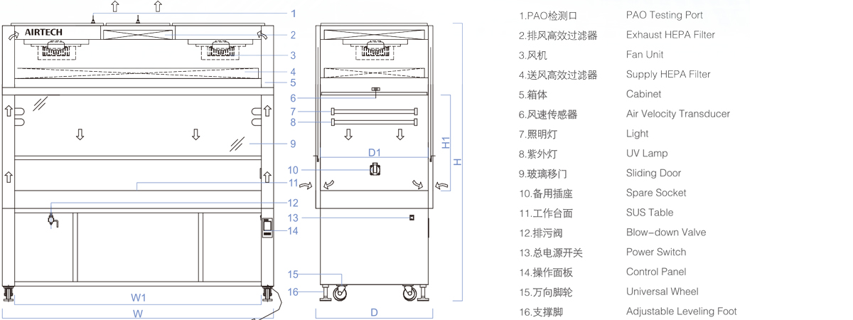具有高效率、低能耗的风量可调送风系统,LED照明和杀菌系统、移门和杀菌系统安全互锁。