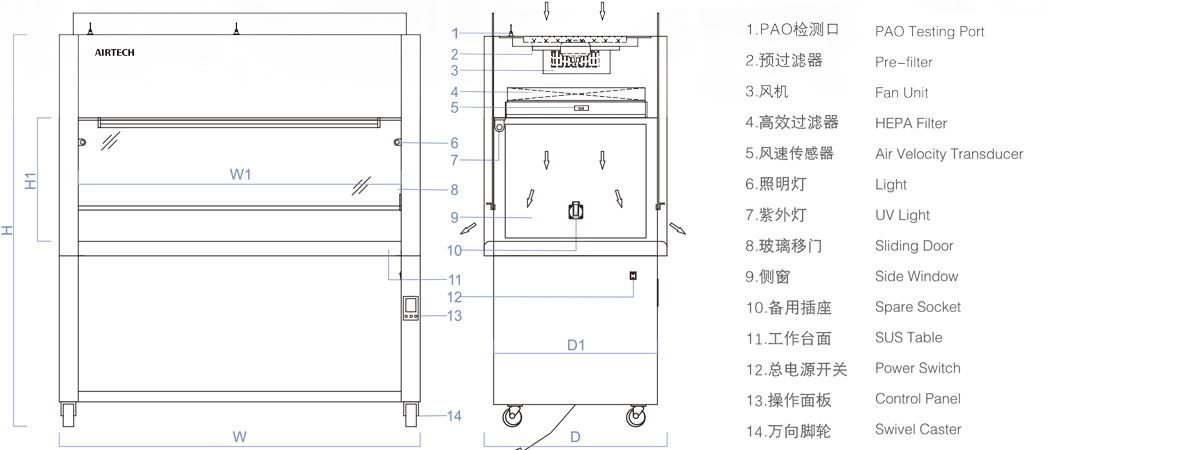 具有高效率、低能耗的风量可调送风系统,LED照明和杀菌系统、移门和杀菌系统安全互锁。