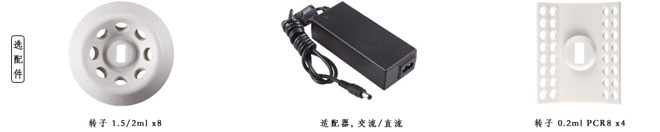 可适配的转子: 角转子 8 x 1.5 ml / 2.0 ml; 角转子 4 x 8 联排PCR管