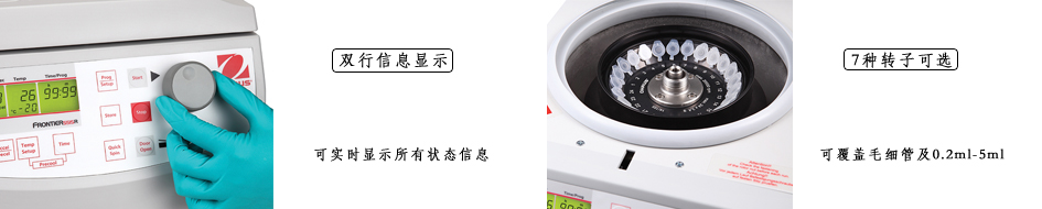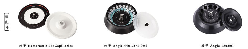 可适配的转子: 角转子 24 x 1.5 ml / 2.0 ml; 气密性角转子24 x 1.5 ml / 2.0 ml; 气密性角转子12 x 5 ml; 角转子 44 x 1.5 ml / 2.0 ml; 角转子 4 x 8 联排PCR管; 气密性角转子30 x 1.5 ml / 2.0; 24毛细血管比容转子