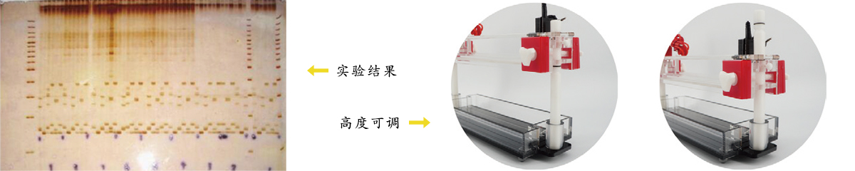2. 创新高度可调式主体结构,可完成多种实验。按照检测目的需要,使用130、190mm 两种不同高度结构。190mm 凝胶可用于SSR 等分子标记实验,重复性好。
