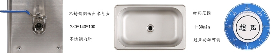 | 型号 | 外形尺寸mm | 内胆尺寸mm | 容积L | 超声频率Khz | 超声功率w | 加热功率w | 控温范围 | 定时范围min | 网架 | 降音盖 | 排水 | 价格 |