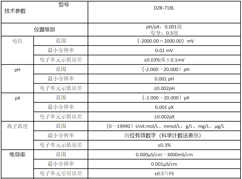 DZB-718L-A主机、E-301-QC型pH三复合电极、DJS-1VTC型电导电极、pH袋装缓冲溶液(3*10)、电导率溶液 1408μs/cm(1*10)、电极挂架、防护套、腕带组装件、便携式防护箱等