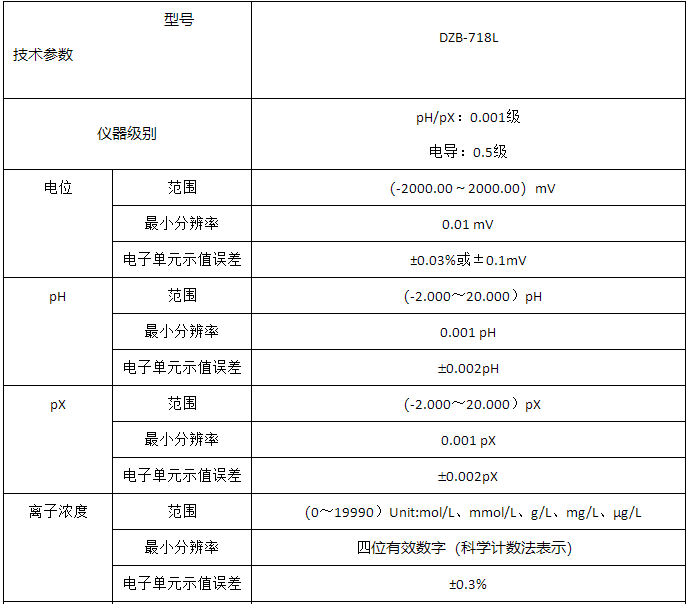 DZB-718L主机、E-301-QC型pH三复合电极、DJS-1VTC型电导电极、DO-958-Q型溶解氧电极、pH袋装缓冲溶液(3*10)、电导率溶液 1408μs/cm(1*10)、电极挂架、防护套、腕带组装件、便携式防护箱等