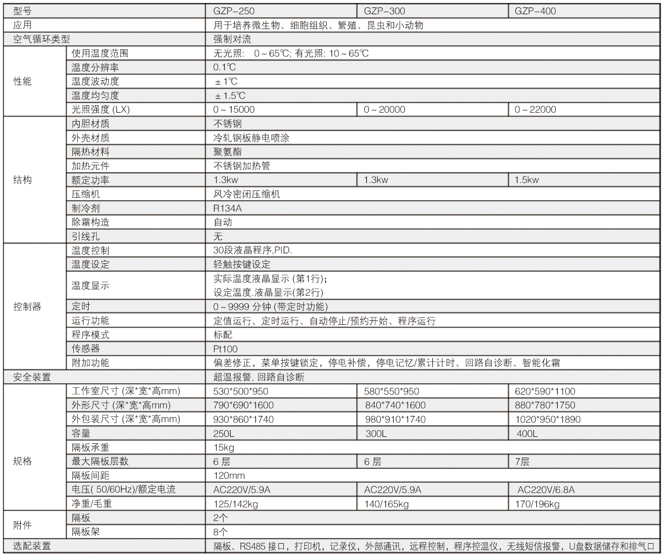 外壳采用优质钢板制作,表面静电喷涂漆膜牢固,造型美观、工作室采用优质镜面不锈钢制作,抗腐蚀、耐老化、四角圆弧设计,易于清洁、无卫生死角,工作室内隔板可随意调节高度,使用户操作更简便。 微电脑程序控制温度、光照度、可设30段程序,每段设置时间范围1-99小时,可以模拟白天和黑夜的温度变化,可选择生长温度环境充足的光源,可模拟大自然多方向性的光源,高度液晶显示屏,周期段数、时间、温度、光照度等一目了然。 安全性能可靠,仪表具有多种抗干扰措施,并具有超温报警保护,参数记忆来电恢复,压缩机延时保护等功能。 箱门采用双门设计保温效果更理想,打开大门可通过内置玻璃门和照明装置观察工作室的物品情况,视野更宽广。 箱体内有冷、热气流风道,有风机运转加强气体循环流畅,提高工作室内的温度均匀性。 光照度6级可调。 采用优质压缩机,环保型制冷剂(R134a)高效率,低能耗,促进节能。 根据用户需要在订货前可加置打印机和RS-485/232接口。